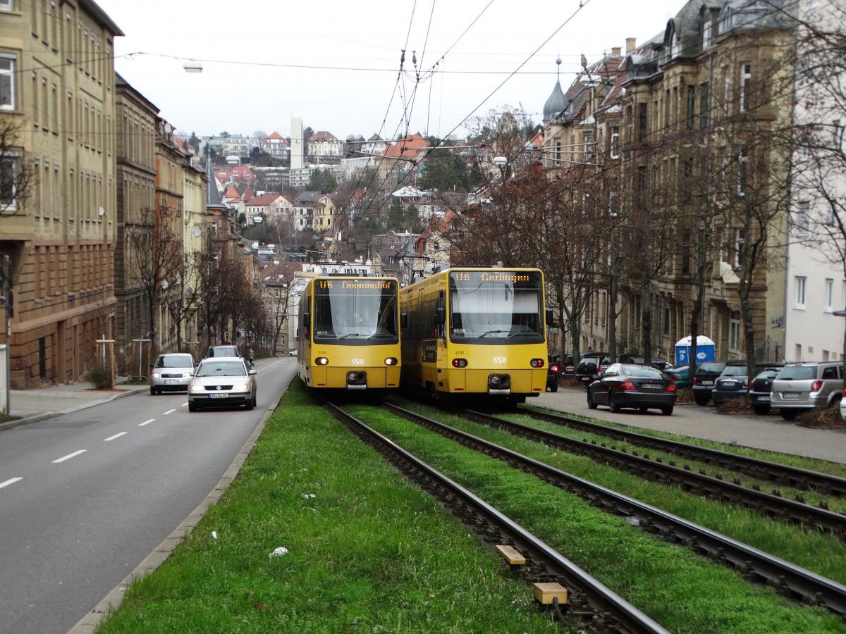 SSB Stuttgart__Von der Straßenbahn zur Stadtbahn. Wer nicht fotografiern "mußte" konnte winken... Hier wurden ein paar Generationen übersprungen: einer der U15 Eröffnungszüge, S-DT 8.11 3399+3400 von 2004 in Parallelfahrt mit Tw 418 von 1925, kurz vor der Haltestelle 'Ruhbank/Fernsehturm'.__08-12-2007 Klaus-Erich Lisk