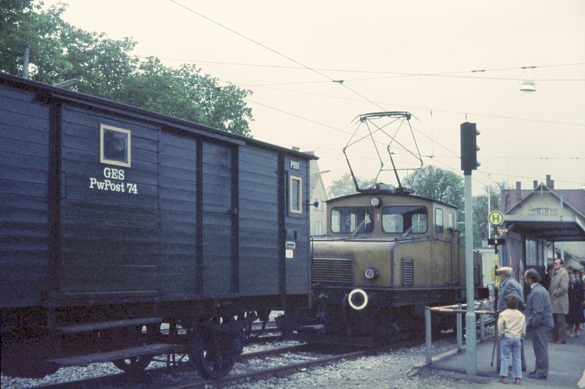 SSB Stuttgart__Arbeitsfahrzeuge der SSB in den 70er und 80er Jahren.__Ebenfalls auf dem Weg zur Ausstellung vor der Gerlinger Wagenhalle: die E-DE-Lok 2010 [Bj.1976;Kaelble-Gmeinder/Siemens], im Schlepptau den Schienenkran 'Bavaria' 2502(ab 1983 2032) [Hoffmann/Kaelble-Gmeinder].__03-09-1977 Klaus-Erich Lisk