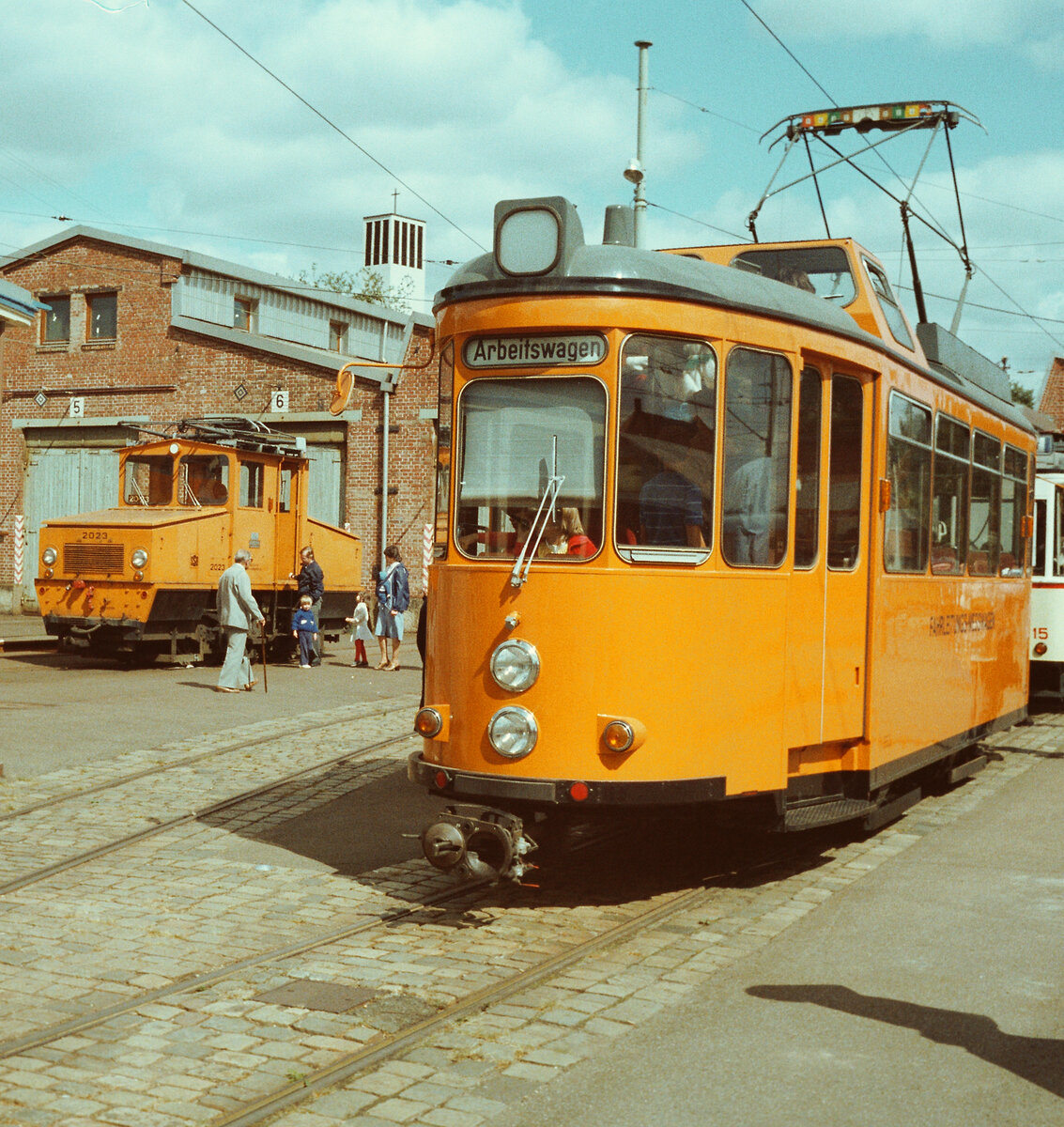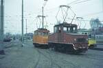 SSB Stuttgart__Arbeitsfahrzeuge der SSB in den 70er und 80er Jahren.__A-Lok 2021 neben ex Filderbahn-Tw WN 26 im Außenbereich der Hw anläßlich 110 Jahre Straßenbahn in Stuttgart.__20-07-1978 Klaus-Erich Lisk