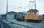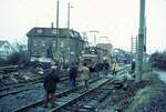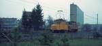SSB Stuttgart_Straßenbahn-Betriebshöfe__Ostheim (Vh4)__Arbeitszug mit Lok 2025 und Schienenwagen fährt von der Ostendstraße ins Betriebshofgelände.__04-04-1972 Klaus-Erich Lisk