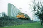 SSB Stuttgart__Gleisbau_Die Diesel-Elektrische Arbeitslok 2011 [4x E-DE-Lok Bj.1981; Kaelble-Gmeinder/Siemens] lugt (noch auf M-Spur) aus dem Stadtbahn-Tunnel von Degerloch zur Haltestelle 'Weinsteige' (zuvor 'Waldau'). Die Stadtbahn wird hier erst 2 Jahre später verkehren. Die Lok 1991 auf N-Spur umgestellt.__08-1988 Klaus-Erich Lisk