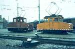 SSB Stuttgart__Arbeitsfahrzeuge der SSB in den 70er und 80er Jahren.__Schleiflok 2005 mit A-Lok 2025_im Bf. S-Möhringen warten auf ihren Einsatz auf der Strecke nach S-Plieningen. Da die Schleiflok nicht mit dem damals neu installierten Indusi-System (ZUB) ausgerüstet ist, wird 2025 als Zug-Lok eingesetzt.__07-03-1974 Klaus-Erich Lisk