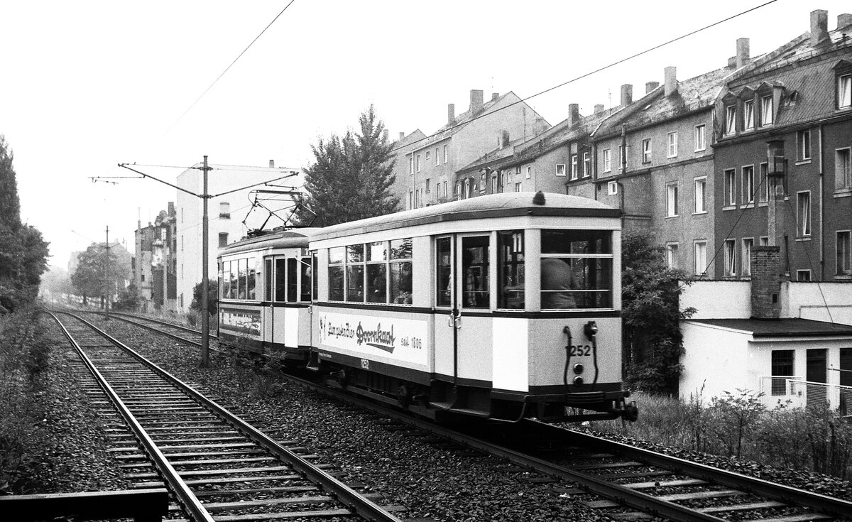 Straßenbahn Nürnberg__Histor. Tw 877 [MAN/SSW, 1935] und Bw 1251 [MAN, 1951] kurz vor der Endstation Erlenstegen hat soeben die Ringbahnbrücke passiert. Dieser Abschnitt (Nbg.Ost - Nbg. Nordostbhf. des bis dahin kompletten Rings wurde 1992 aufgehoben und abgebaut, die Straßenführung adäquat verkehrsflußfreundlich umgestaltet.__Sommer 1985 Klaus-Erich Lisk