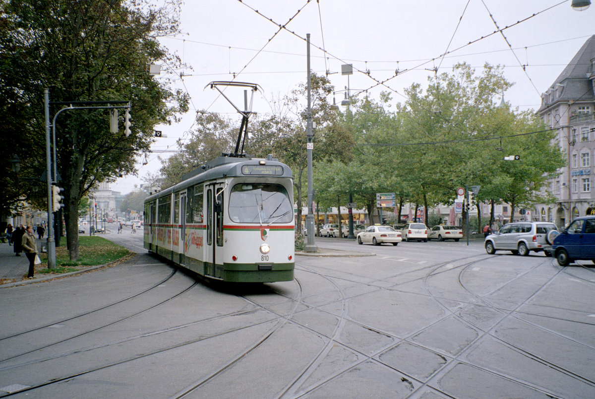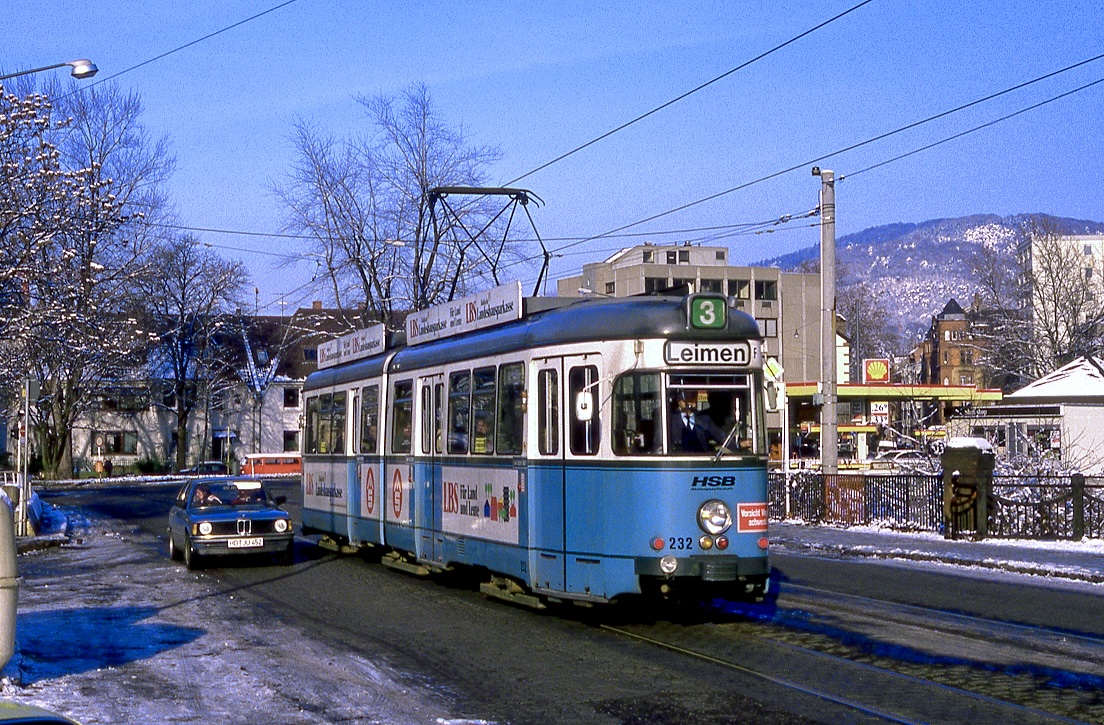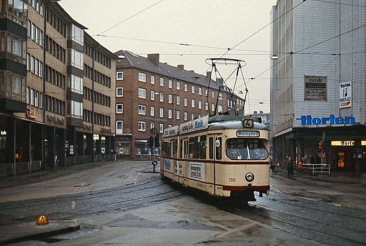 Am 27.04.1985 überquert der Kieler Tw 268 auf dem Weg nach Wellingdorf den Dreiecksplatz. Seit 30.09.1984 bogen die Straßenbahnen wegen der schon laufenden Bauarbeiten für den Busverkehr nicht mehr über die links abbiegenden Gleise in die Bergstraße ab, sondern befuhren die sogenannte "Katastrophenschleife" durch die Brunswiker Straße. Horst Lüdicke