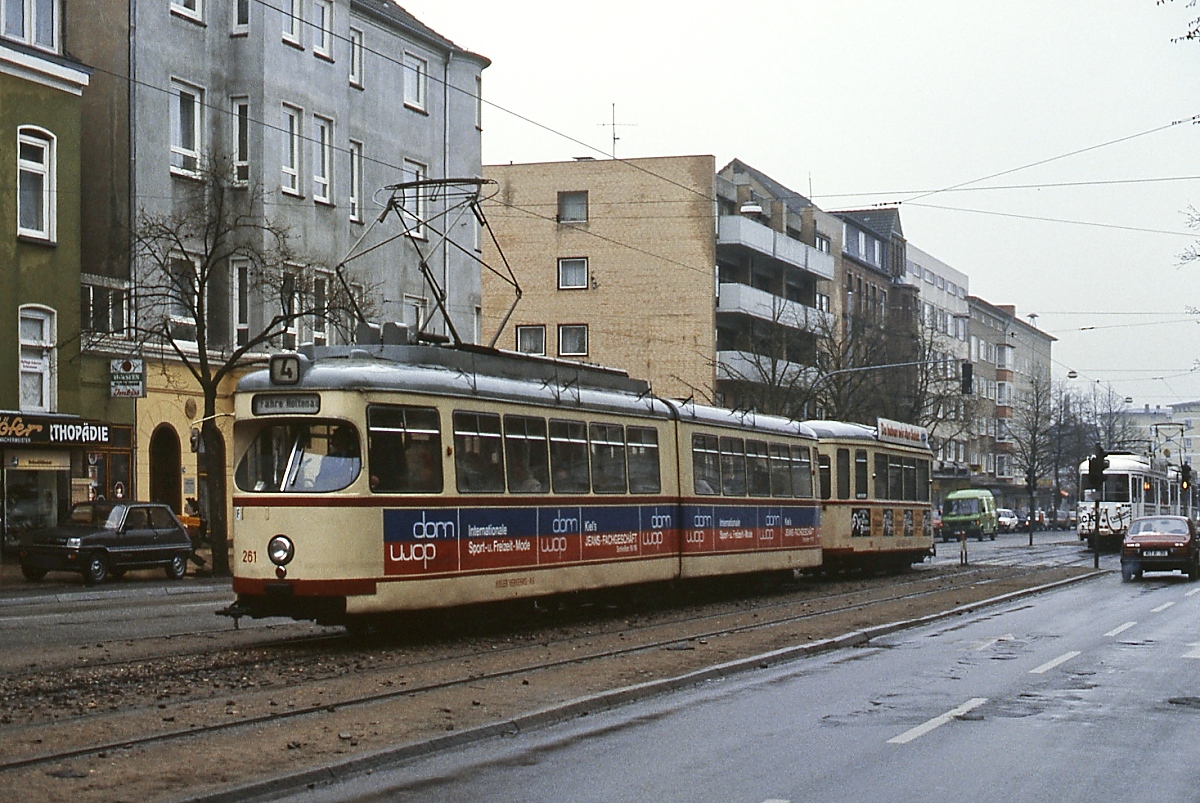 Bis zum Betriebsende waren die Kieler Sechsachser mit modernisierten zweiachsigen Beiwagen aus dem Jahre 1939/40 gekuppelt, am 27.04.1985 fährt der Tw 261 in Richtung Schleuse Holtenau Horst Lüdicke