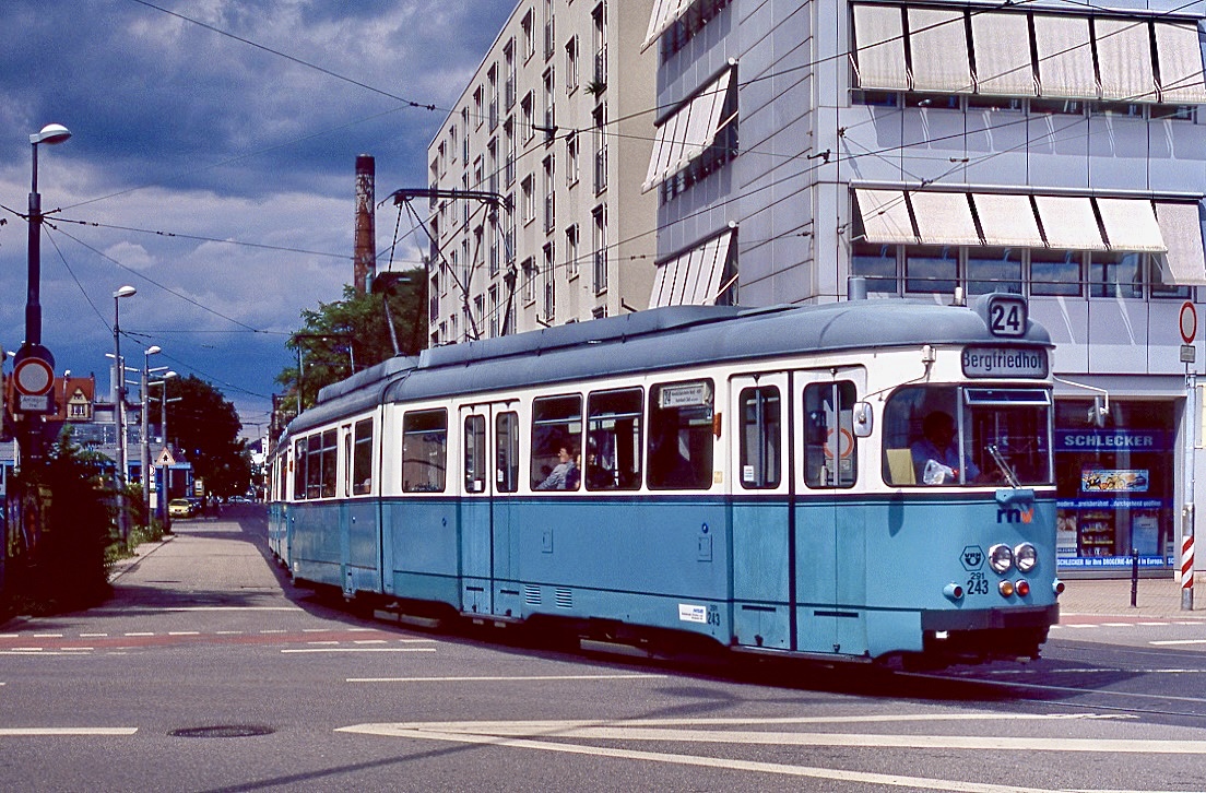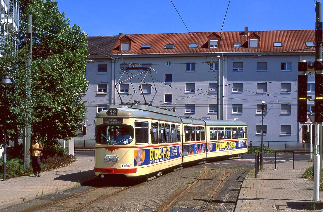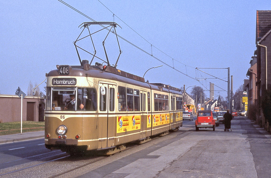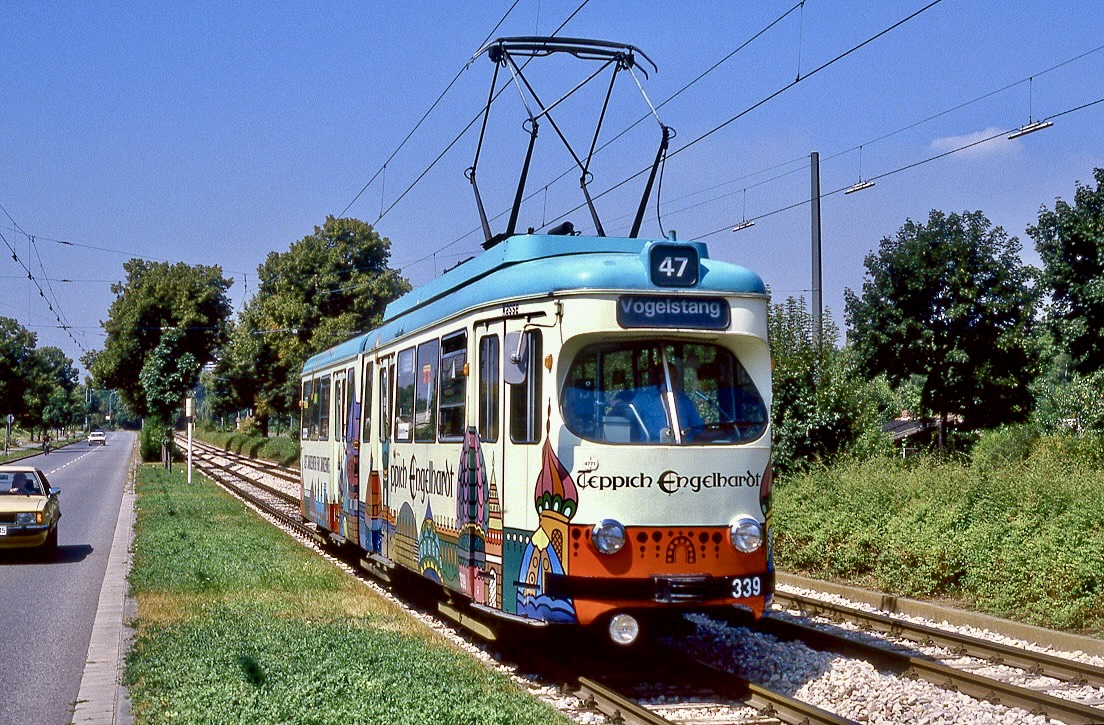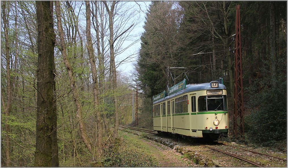 Nahe der Haltestelle Petrikshammer fährt der 1957 gebaute Düwag Triebwagen 275 die Steigung Richtung Kohlfurter Brücke bergab.