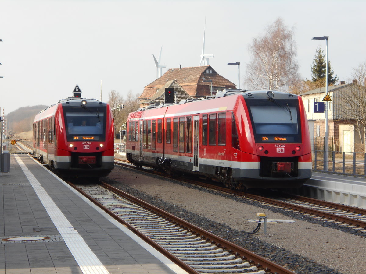 Zugkreuzung in Reuterstadt Stavenhagen am 17.Februar 2019.623 520,mit dem RE Bützow-Pasewalk,kreuzte mit dem Gegenzug,gefahren vom 623 027. Mirko Schmidt