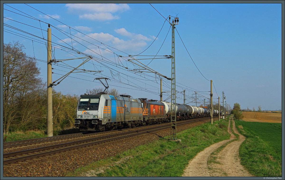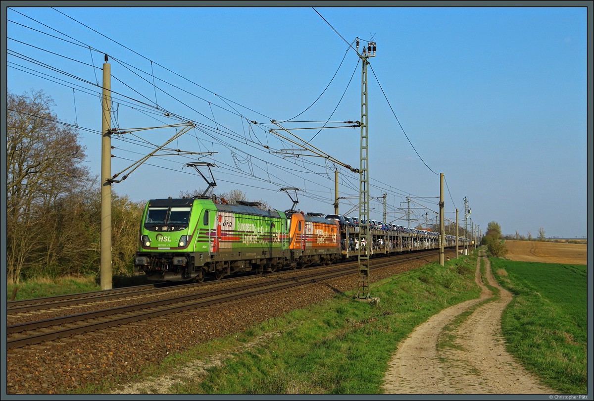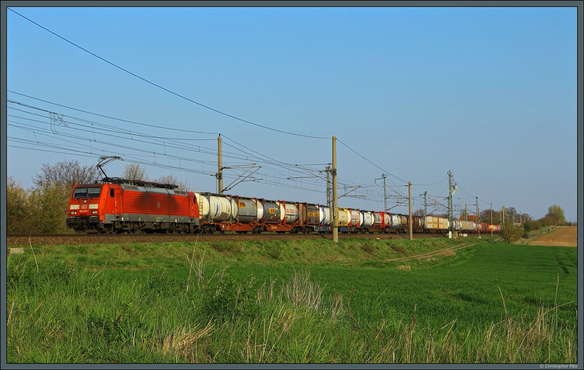 Im Streiflicht zieht 189 213 der LTE Netherlands ihren Kesselzug an den für Sachsen-Anhalt typischen Windrädern vorbei. (bei Wellen, 07.04.2019) Christopher Pätz