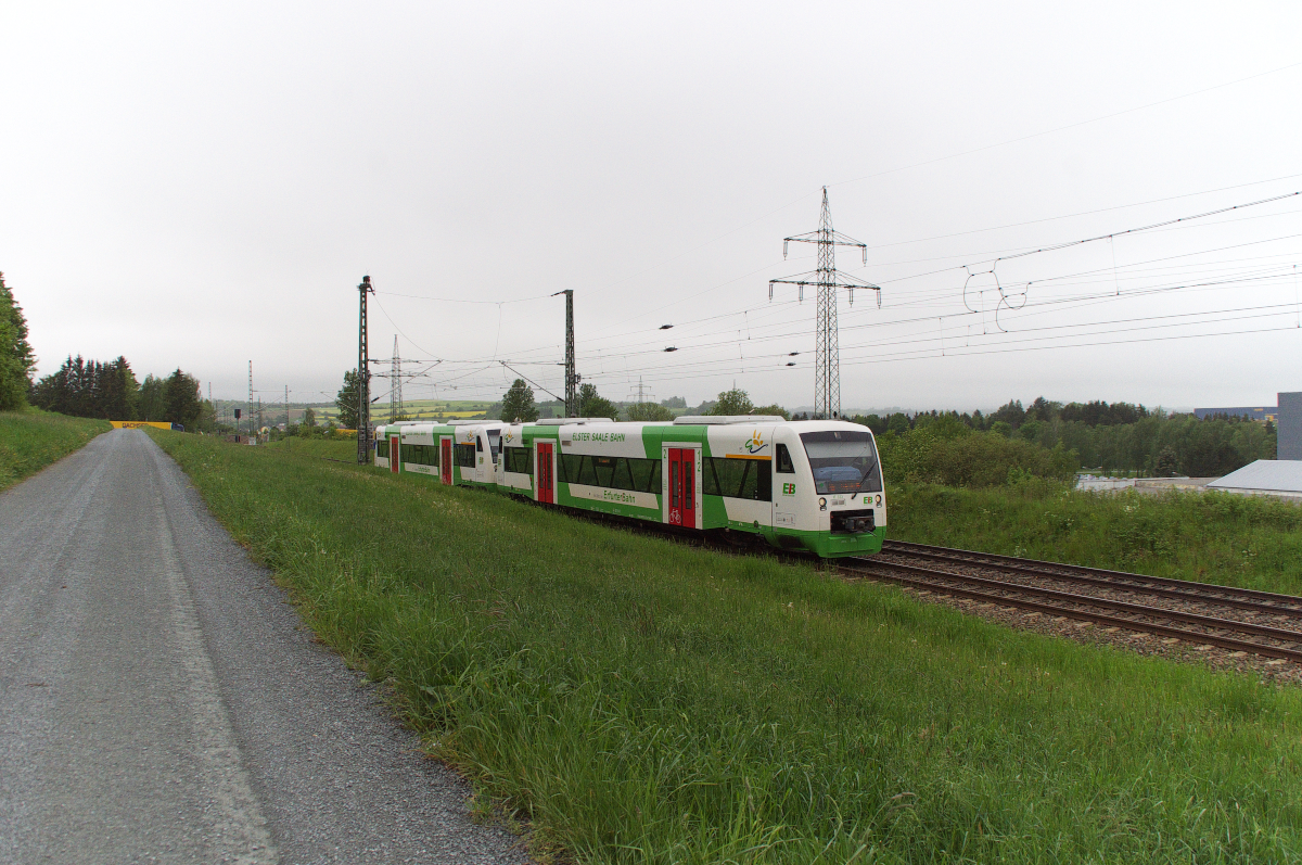 VT 336 der Erfurter Bahn rollt die Höhen des Vogtlandes herunter. EB Hof - Gera wird in Mehltheuer die Bahnstrecke 6362 verlassen und über Zeulenroda und Weida nach Gera fahren. 18.05.2015