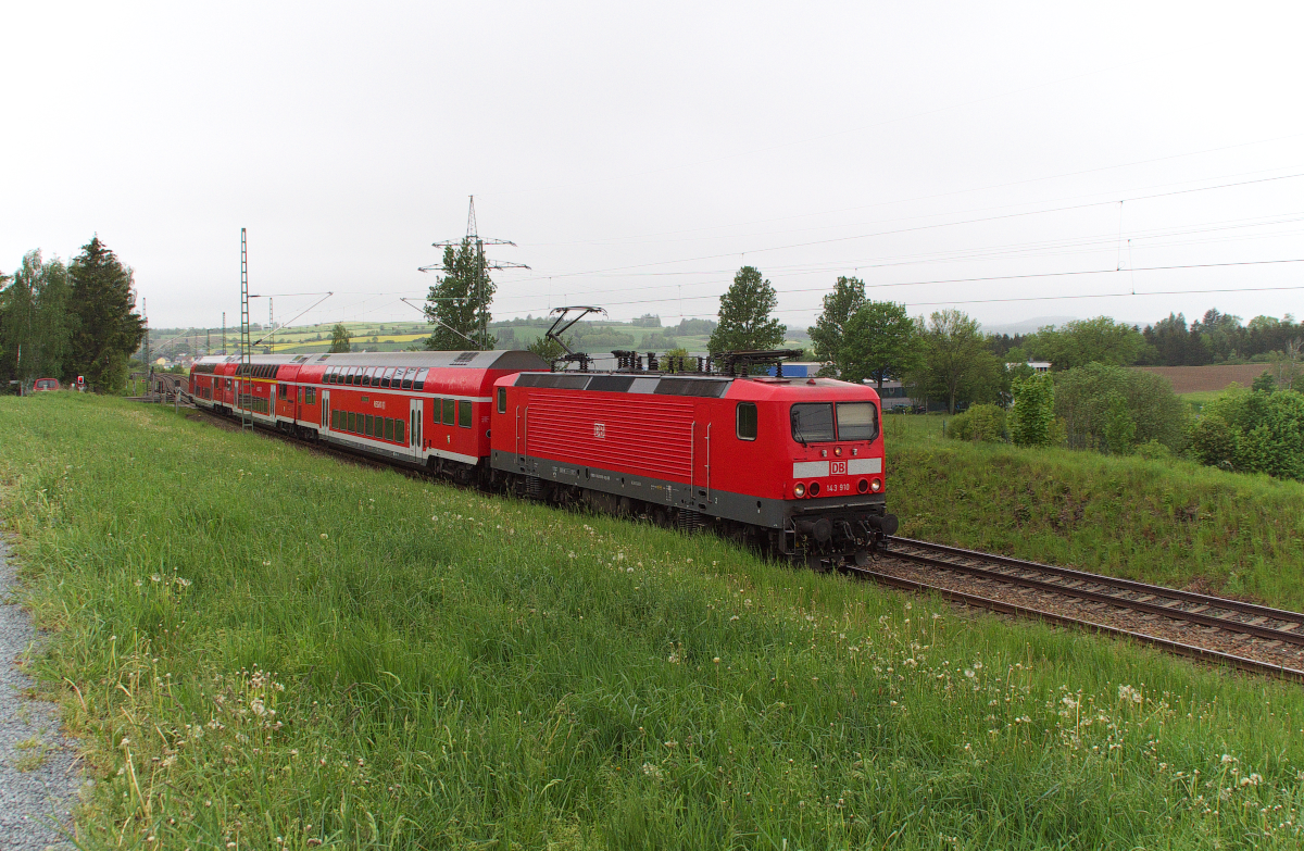 RE 3 Hof - Dresden - Schon wieder sind ihre Tage gezählt. Die ex Trierer 143 910 muss schon wieder gewohnte Gleise verlassen. Nachdem der SÜWEX an Mosel, Saar, Rhein und in der Pfalz die RE Leistungen übernommen hatte, musste 143 910 zurück zu ihren Ursprüngen in den Osten der Republik und versah über 2 Jahre ihren Dienst auch auf der Relation Dresden - Hof. Im Sommer 2016 soll auch dieses Einsatzgebiet verloren gehen und Triebwagen werden auch hier das neue Bild der Eisenbahn bestimmen. Bahnstrecke 6362 Leipzig - Hof beim Werk von Viessmann bei Hof am 24.05.2016