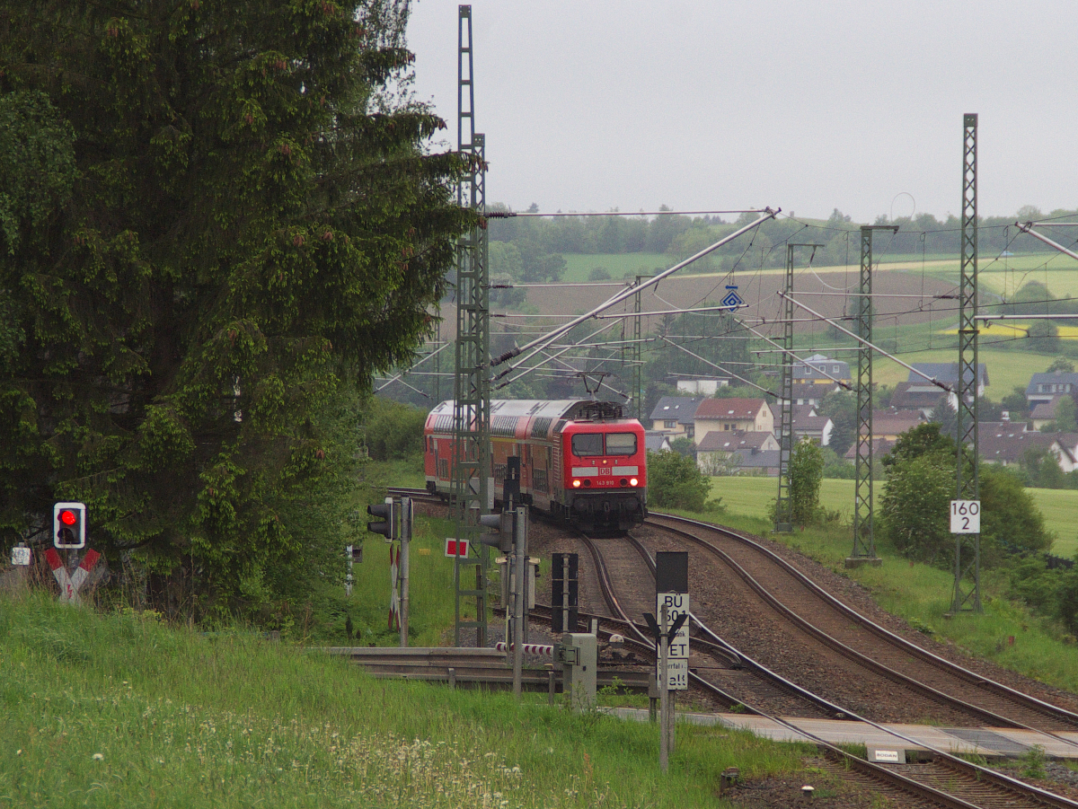 143 893-6 schiebt ihren RE aus Dresden der Endstation Hof entgegen. Kurz vor dem Zielbahnhof hat der Zug den BÜ Km 160,1 an der Bundesstraße 2 überquert. Bahnstrecke 6362 Leipzig - Hof am 24.05.2016