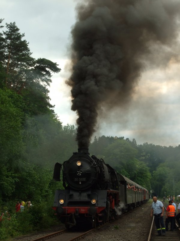 50 3552 lässt Dampf ab.Kurz vor der Abfahrt mit ihrem Dampfpendelzug.Am Zugschluss hing 260 109-4.Der Grund für die Pendelfahrten war die Teileröffnung der Brexbachtalbahn.Grenzau 1.6.09 Frank Brendler