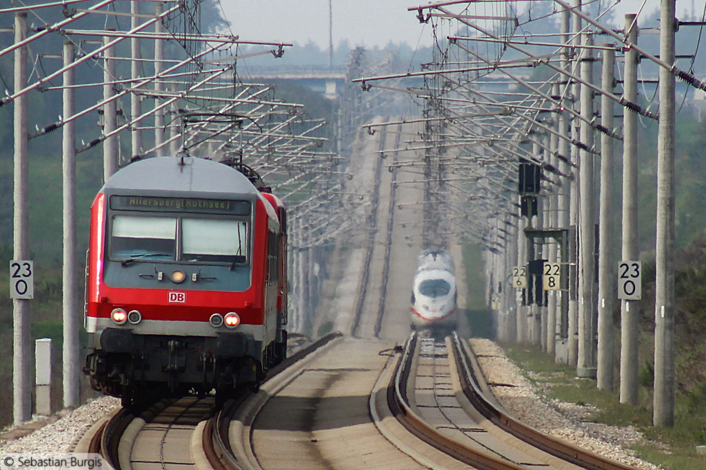 Begegnung zweier Generationen: Der im Hintergrund verschwindende ICE Richtung Nürnberg hat vor kurzem die Fahrgäste der Regionalbahn nach Allersberg ordentlich durchgeschüttelt ;) (Allersberg, 01.05.2013) Sebastian B.