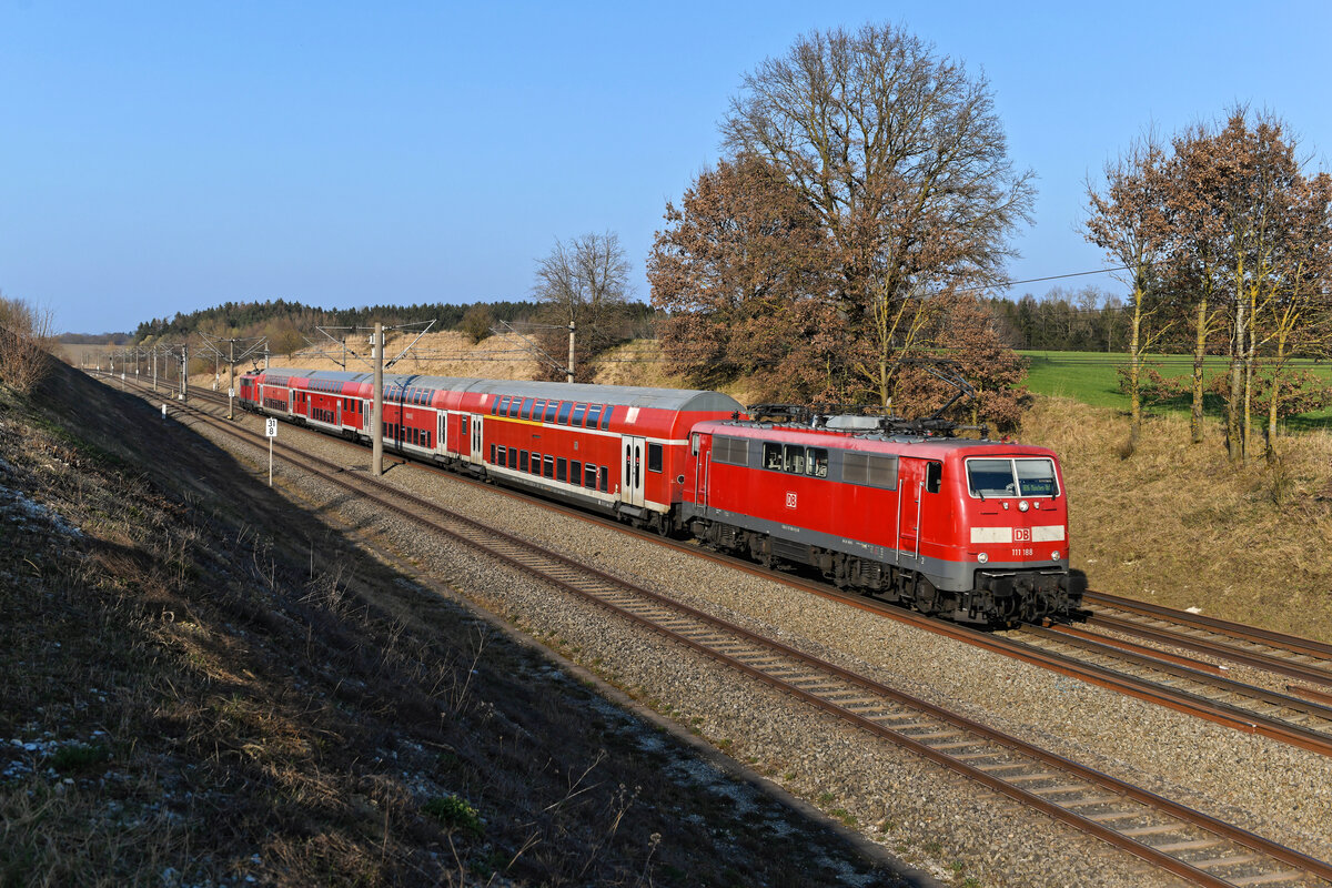 Am 25. März 2022 wurde die RB 59097 von Nürnberg HBF nach München HBF statt mit dem planmäßigen Twindexx mit einer Doppelstockwagen-Garnitur und einer Sandwich-Bespannung mit Loks der Baureihe 111 gefahren. Die Aufnahme entstand bei Vierkirchen im Dachauer Hinterland. Christoph Schneider