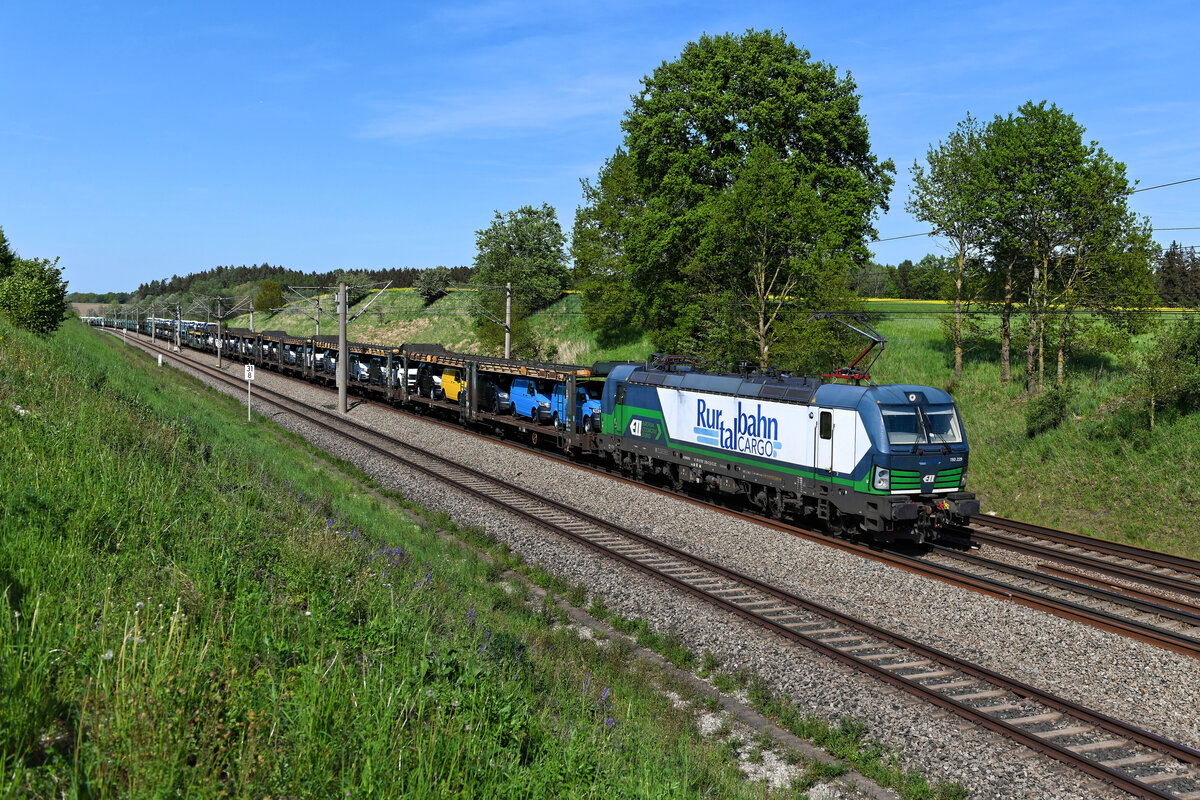 Leistungen der Rurtalbahn Cargo lassen sich im Münchner Raum eher selten beobachten. Am 11. Mai 2022 brachte die von ELL angemietete 193 229 einen Autotransportzug, beladen mit Produkten aus dem Hause Volkswagen, bei Vierkirchen im Dachauer Hinterland südwärts. Es kann aber natürlich sein, dass der Vectron an ein anderes EVU verliehen war. Christoph Schneider