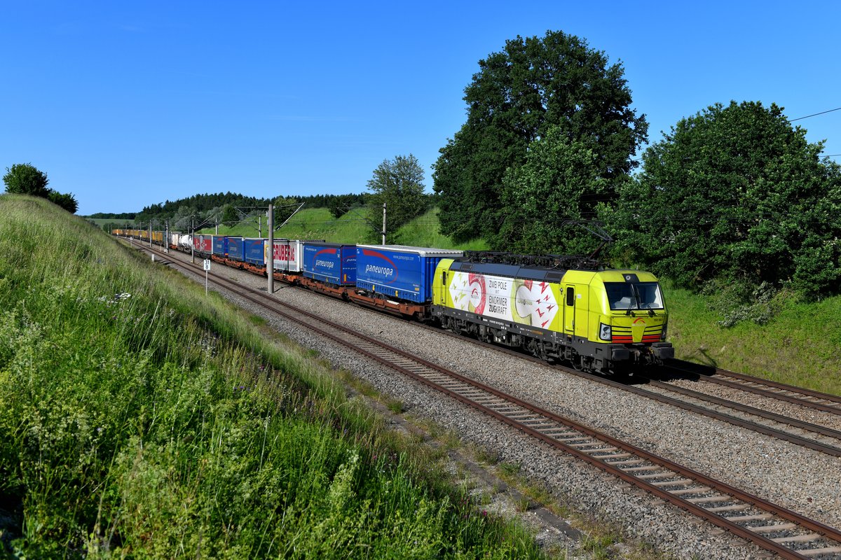Frisch gewaschen kann die "Landplage" ELL-Vectron auch eine gewisse Attraktivität verströmen. Am 07. Juni 2019 betätigte ich gerne den Auslöser meiner Nikon, als die an TXLogistik vermietete 193 731 mit dem komplett beladenen KLV-Zug DGS 43141 von Lübeck Skandinavienkai nach Verona Q.E. meinen Standpunkt bei Vierkirchen im Dachauer Hinterland passierte. Christoph Schneider