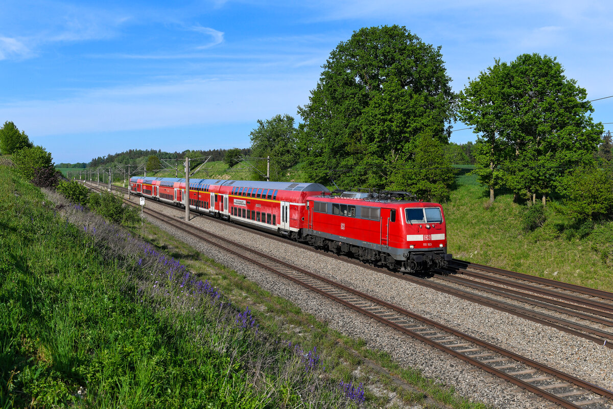 Die 111 163 verstärkt seit Ende 2019 den Bestand der Baureihe beim BW München 1. Davor war sie lange in Baden-Württemberg rund um Stuttgart aktiv. Am 04. Mai 2024 konnte ich die Lok vor dem RE 59157 von Treuchtlingen nach München HBF bei Vierkirchen fotografieren. Bemerkenswert ist auch die Wagengarnitur von DB Gebrauchtzug mit ihrem hohen 1. Klasse Anteil. Zudem verkehrte der Zug "gedreht", üblicherweise steht die Lok Richtung Ingolstadt. Zum Aufnahmezeitpunkt war der Lavendel am Bahndamm in voller Blüte. Christoph Schneider