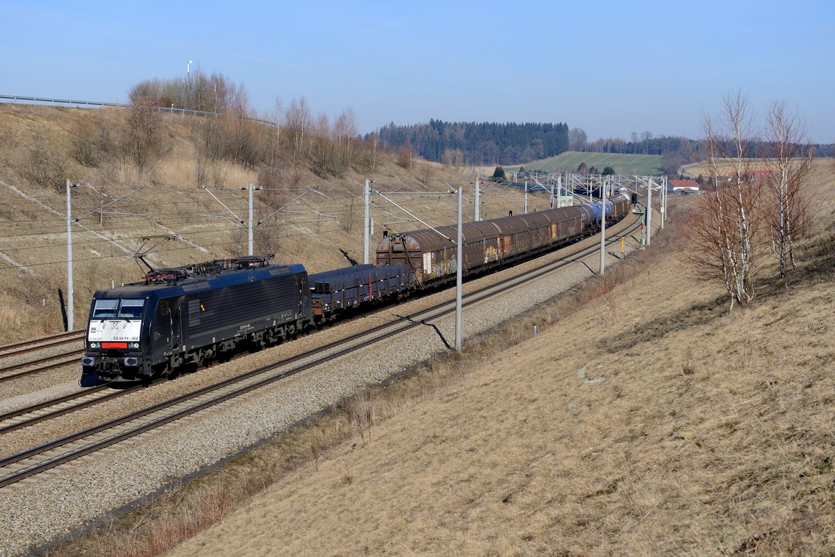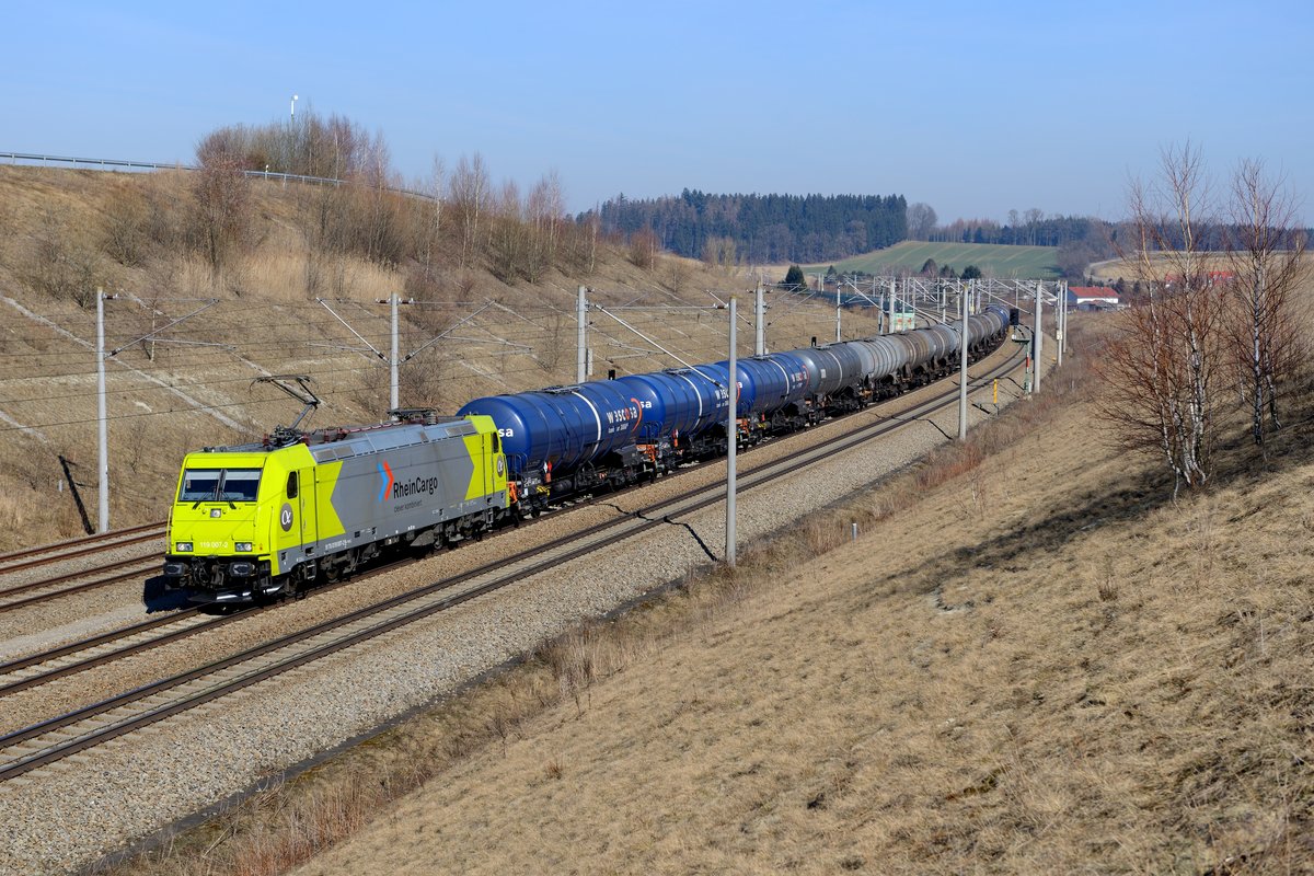 Auch DB Schenker ist nach wie vor im Mineralöl-Transport zwischen Ingolstadt und München tätig, so z.B. am 10. März 2015 die 185 284, die am Vormittag mit einem langen Ganzzug, bestehend aus Kesselwagen, bei Unterweilbach fotografiert werden konnte. Christoph Schneider