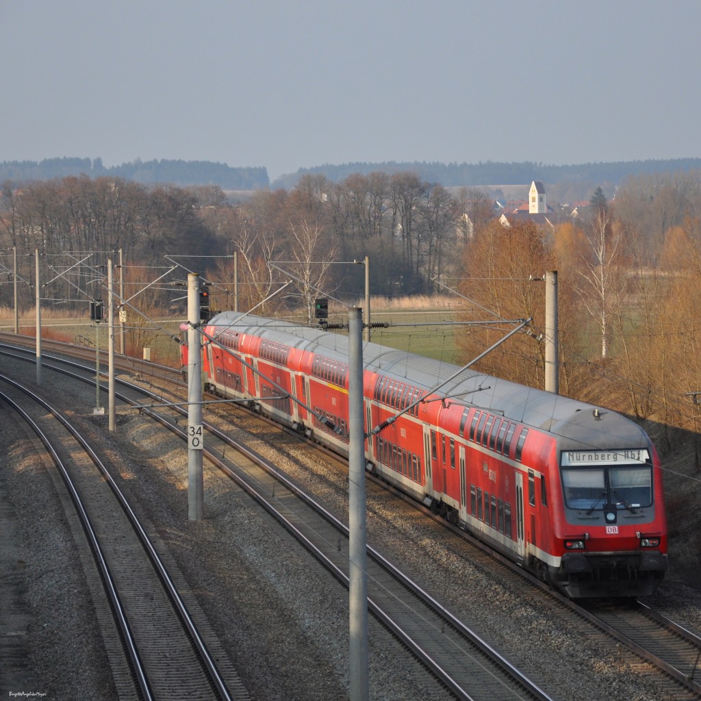 Blick von der Brücke in Asbach kurz vor Petershausen und ein Nachschuss auf eine BR 111 mit Doppelstockwagen der 3. Generation, der in Richtung Nürnberg unterwegs ist … Im Hintergrund auf der rechten Seite ragt der Kirchturm von St. Laurentius von Petershausen hervor. 15.03.2015. Brigitte Meyer