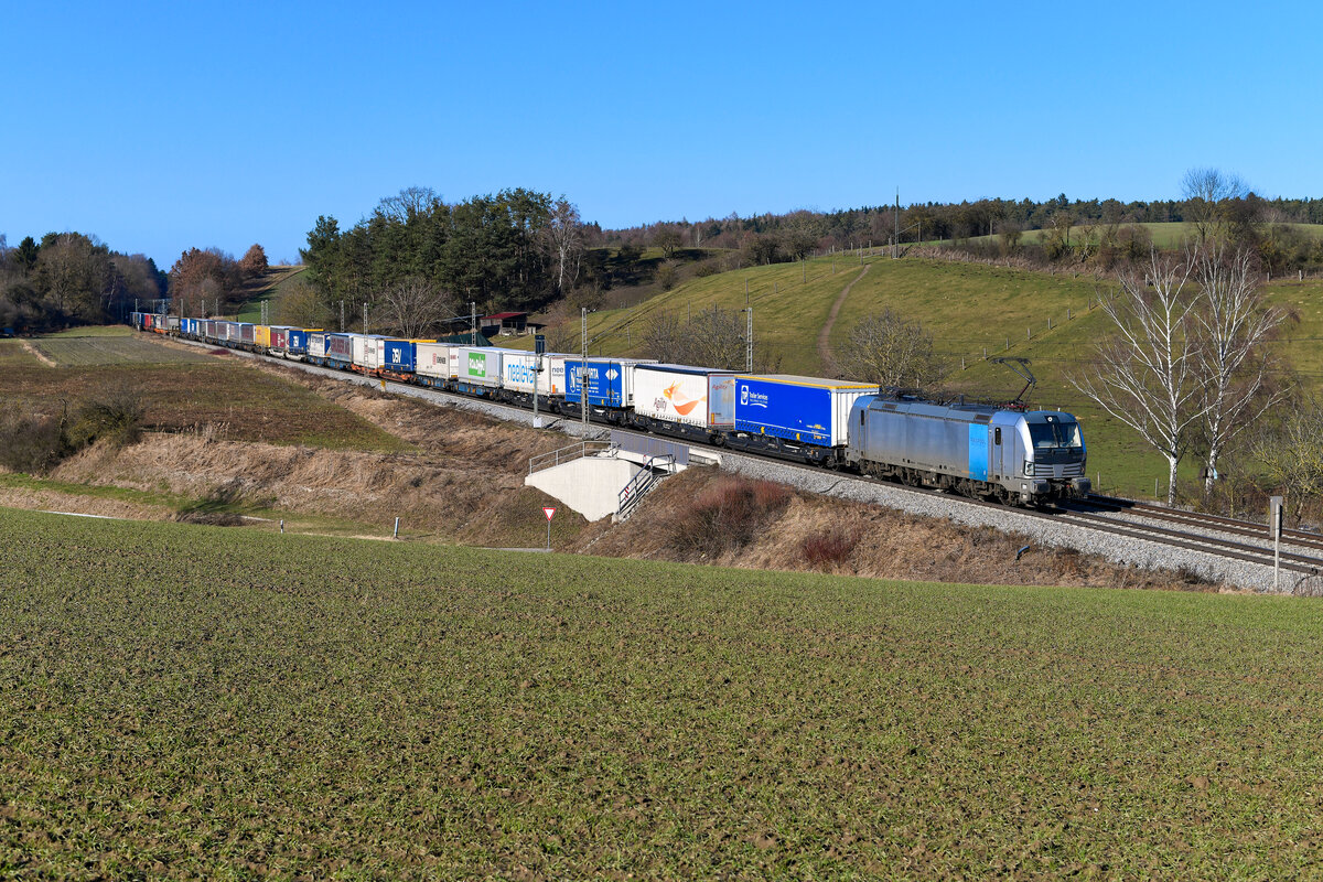 Als leuchtendes Beispiel für nachhaltigen Güterverkehr im Auftrage der Natur - so stellt sich die für TXLogistik fahrende 193 283 von ELL dar. Am 27. Januar 2024 bespannte sie den DGS 40559 von Waalhaven Zuid nach Verona Q.E., der sich gut und bunt beladen zeigte. Diesen Vectron bekommt man im Brenner-Verkehr recht selten zu sehen, nach meinen Beobachtungen kommt eher eher vor KLV-Zügen zum Einsatz, die den Weg über das Rheintal und den Gotthard nehmen. Jedenfalls habe ich den Auslöser gerne betätigt, als der Zug bei Fahlenbach an mir vorbeifuhr. Christoph Schneider
