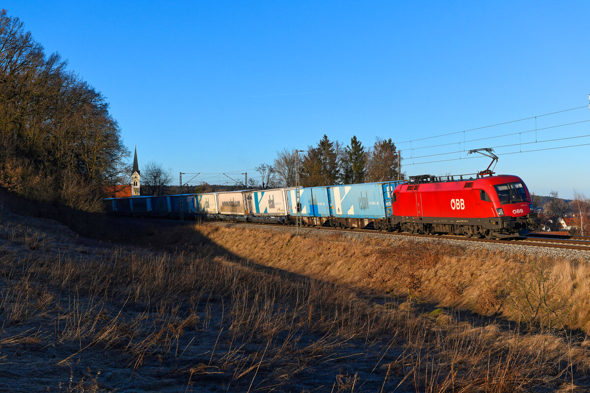 Zum Jahresbeginn hat die ÖBB-Tochter RCC die Traktionierung der meisten Ekol-KLV-Züge in Deutschland übernommen. Am 27. Januar 2024 konnte ich die 1116.145 vor einem solchen Zug bei Fahlenbach aufnehmen. Ziel der Fahrt war Triest. Für die Fahrt über den Tauern wird es ab Schwarzach-St. Veit eine Vorspannlok geben. im italienischen Grenzbahnhof Tarvisio endet dann für den Taurus die Reise.