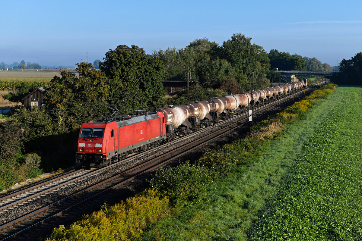 DB Cargo vor einem Ganzzug mit Knickkesselwagen ist in Bayern eher selten zu beobachten. Am 23. September 2021 war die 185 282 mit einer solchen Leistung bei Langweid am Lech südwärts unterwegs. Christoph Schneider