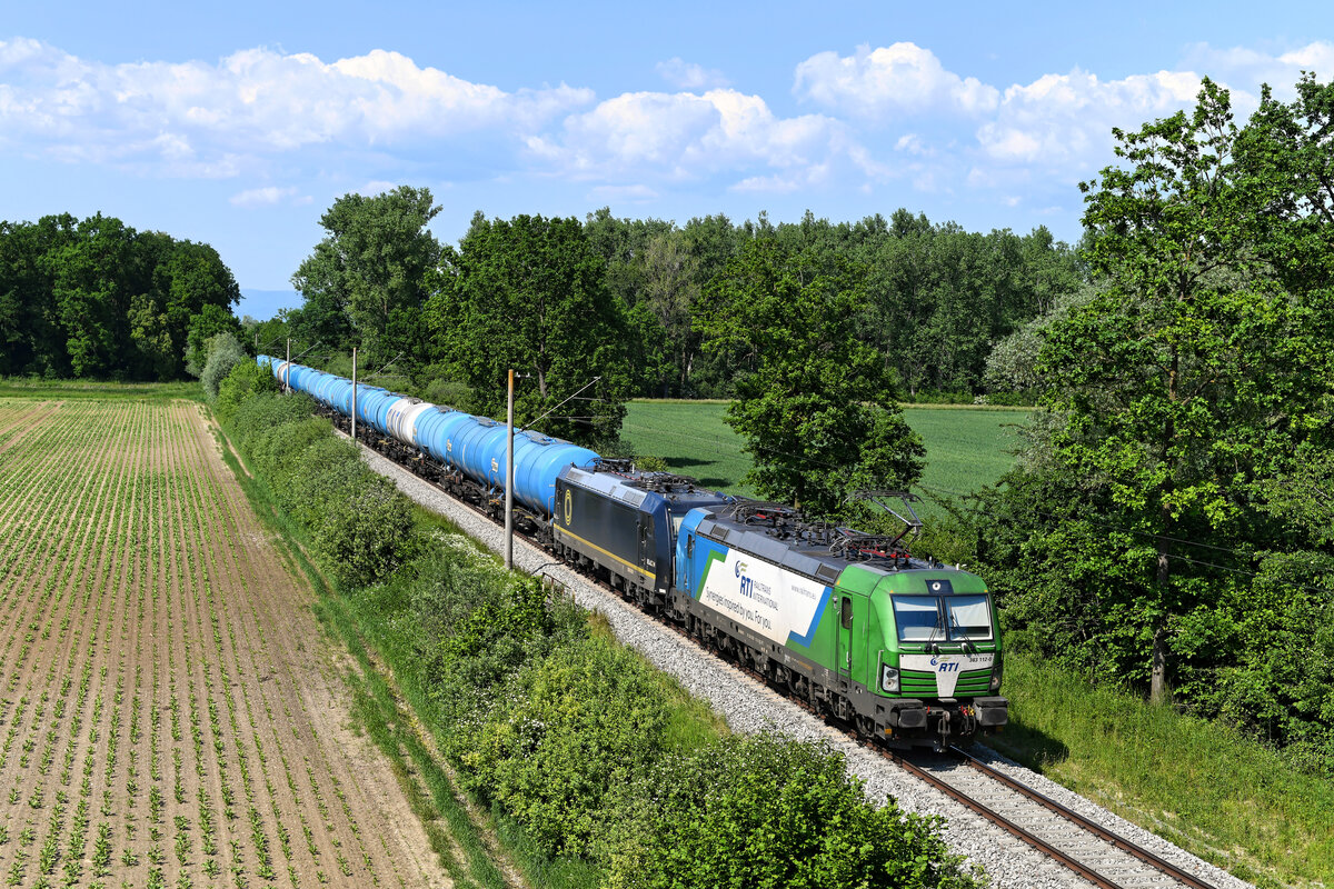 Als wären an diesem Tage nicht schon genug ELL Vectrons zu sehen gewesen, kamen sie zum Abschluss noch im Doppelpack. Am Abend des 28. Mai 2023 war ein Gaskesselwagenzug der FRACHTbahn ab Passau eingelegt, der aufgrund von Bauarbeiten ebenfalls den Weg über Landshut nehmen musste. Zugloks waren die 193 724 und 230, die ich bei Wallersdorf in Niederbayern aufnehmen konnte. Christoph Schneider