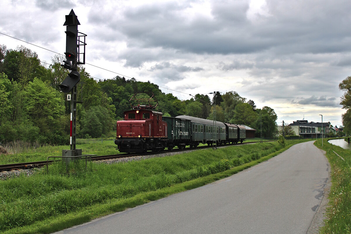 Der Bayerische Localbahn Verein ist mit E69 005 und einem Sonderzug unterwegs zurück von Prien am Chiemsee nach München Ost und verlässt hier gerade bei schwierigen Lichtverhältnissen den Bahnhof Bruckmühl. (18.05.2023) OMSIJakob LP