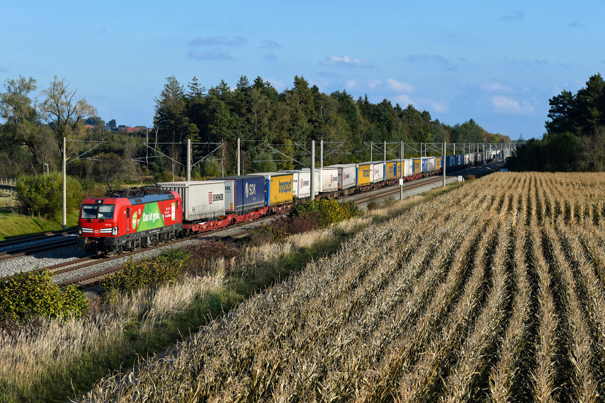 "Das ist grün." im Blockabstand: Der bereits gezeigten 185 205 folgte die ebenfalls die Energiesparolympiade von DB Cargo bewerbende 193 357 mit dem KT 42150 von Verona Q. E. nach Rostock Seehafen. Allerdings verkehrte dieser Zug zwischen Olching und Augsburg über die für den Nah- und Güterverkehr vorgesehenen Gleise. Bei Hörbach entstand ein Bild mit einem kurz vor der Abernte stehenden Maisfeld (16. Oktober 2021). Christoph Schneider