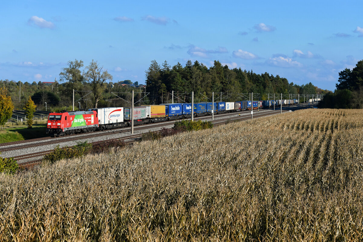Neben einigen Loks der Baureihe 193 wirbt auch die 185 205 für die "Energiesparolympiade" von DB Cargo. Am 16. Oktober 2021 bespannte sie ab München Ost Rbf den KT 50226 von Verona Q. E. nach Hamburg Billwerder Ubf. Zwischen Olching und Augsburg wurde über die Fernverkehrsgleise gefahren. Bei Hörbach konnte ich die Leistung aufnehmen. Christoph Schneider