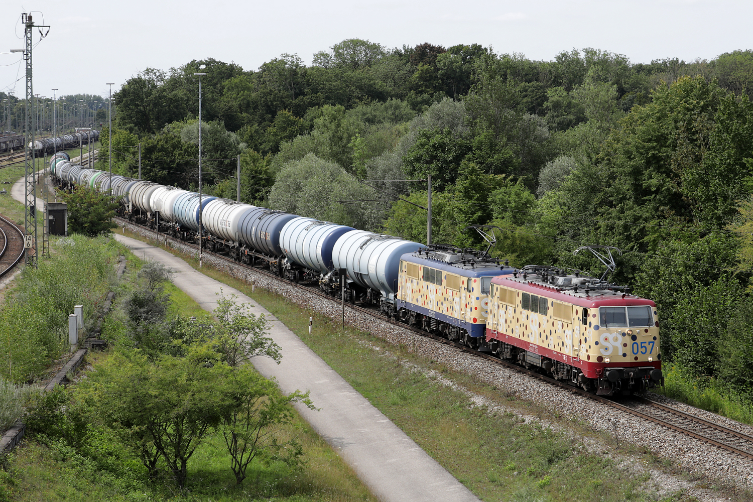 RheinCargo 185 350 "Grenzenlos für Sie im Einsatz" fährt mit ihren Kesselwagen in die südl. Umgehung des Rangierbahnhofs München Nord ein, 16.05.2020 Stefan Mayer