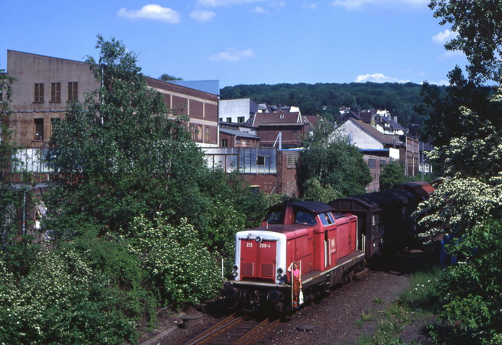 212 298 auf der Ennepetalbahn zwischen Hagen und Altenvoerde. Im Bereich Gevelsberg verläuft die Strecke wie eine Straßenbahn entlang der Kölner Straße 11.05.1993. Christian Wenger