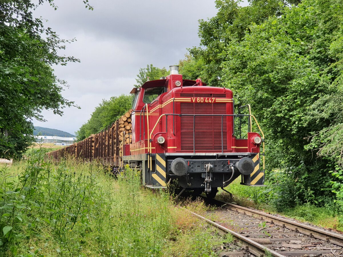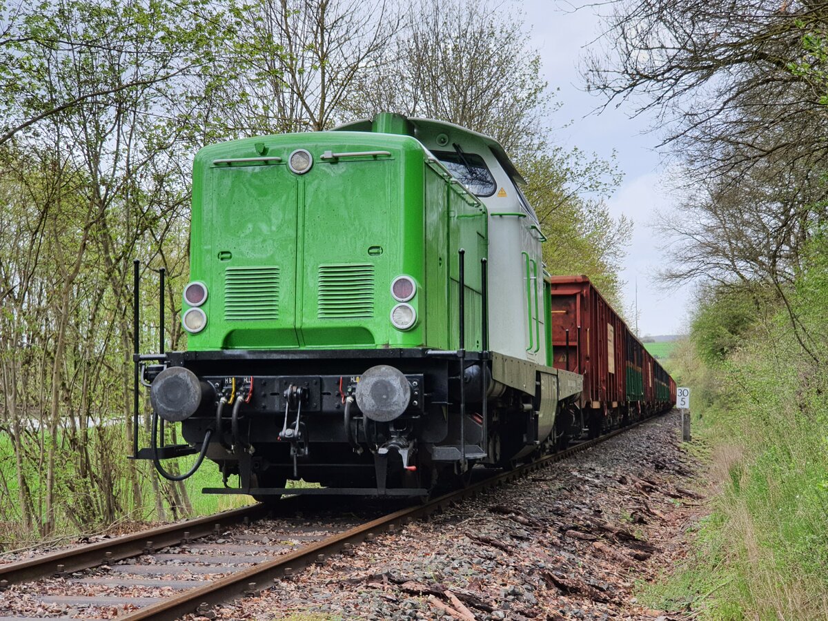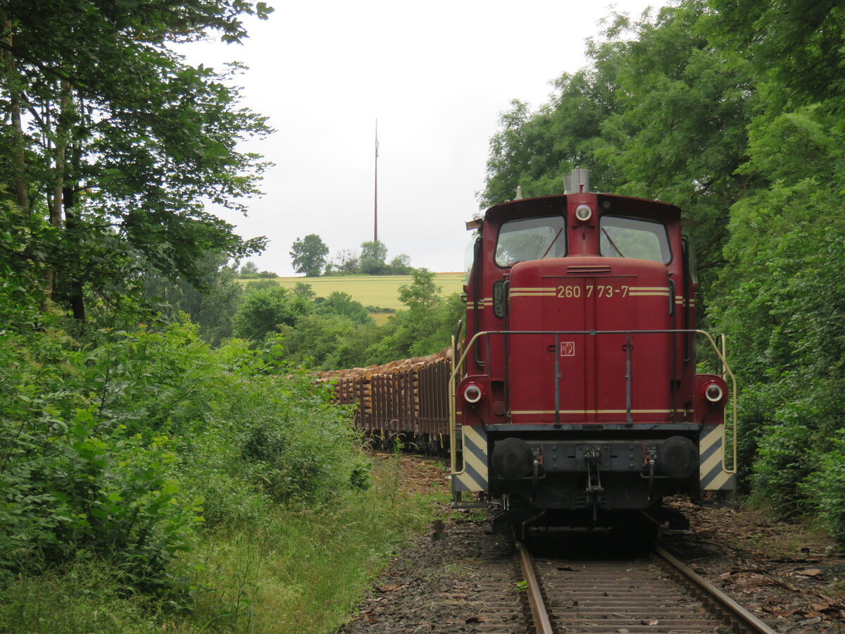 V150.02 (92 80 1275 501-5 D-HGB) der Hessischen Güterbahn wartet an der Holzverladestelle Breidenstein an der ehemaligen Scheldetalbahn auf die Beladung der Holzzuges von ERMEWA joma