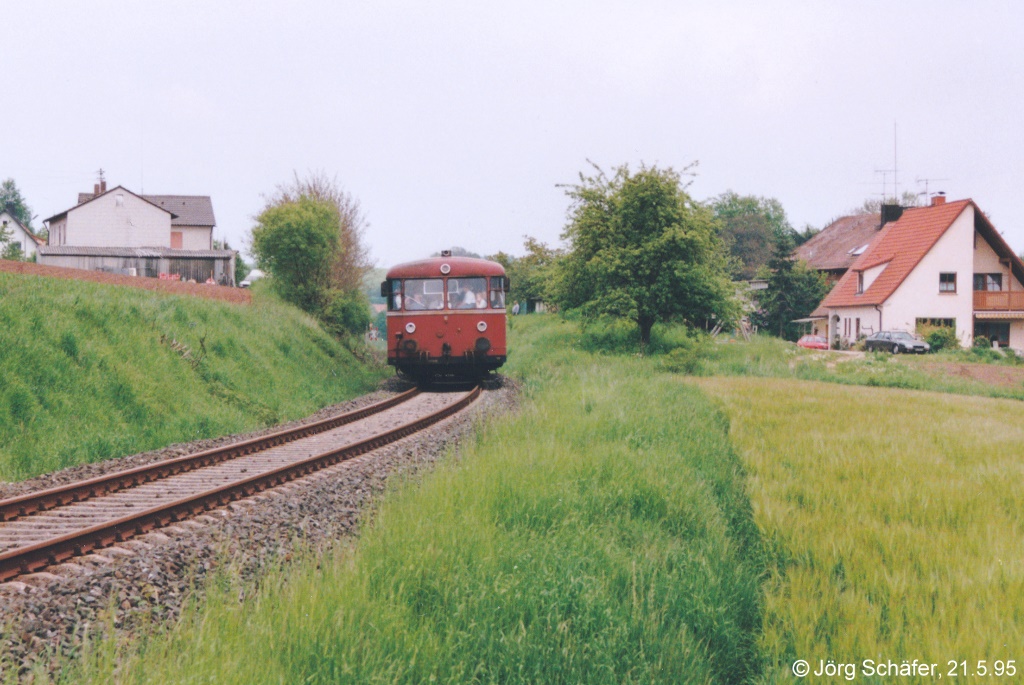 996 773 und 796 724 am 21.5.95 auf dem Weg nach Frensdorf bei Stecken-Kilometer 27. Im Hintergrund sieht man den Kirchturm von Burgwindheim.