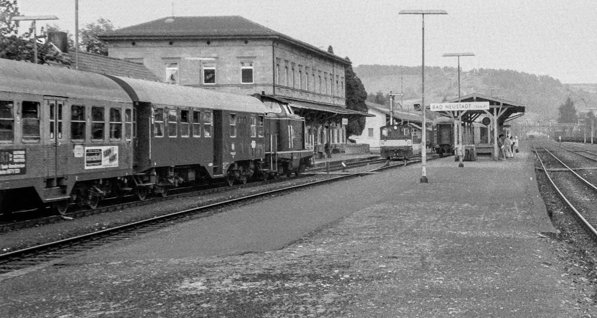 Am 15.5.88 stand in Bad Neustadt auf Gleis 1 die Garnitur für die nächste Fahrt nach Bischofsheim bereit. Auf der doppelten Kreuzungsweiche zwischen Empfangsgebäude kam die Kleinlok von der Bedienung der Anschlüsse im Stadtgebiet zurück. Jörg Schäfer