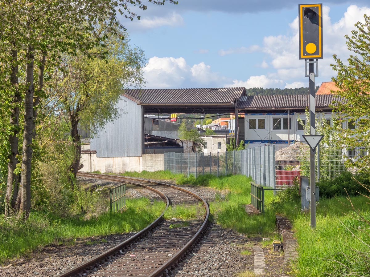 Das Gleis nach Bischofsheim (Rhön) bog schon mitten im Bahnhof Bad Neustadt (Saale) zwischen Empfangsgebäude und Güterabfertigung ab. (4. Mai 2016) Jörg Schäfer