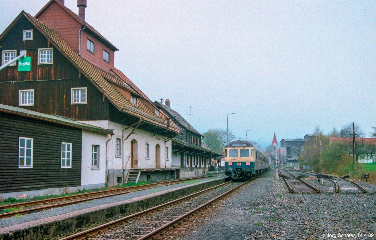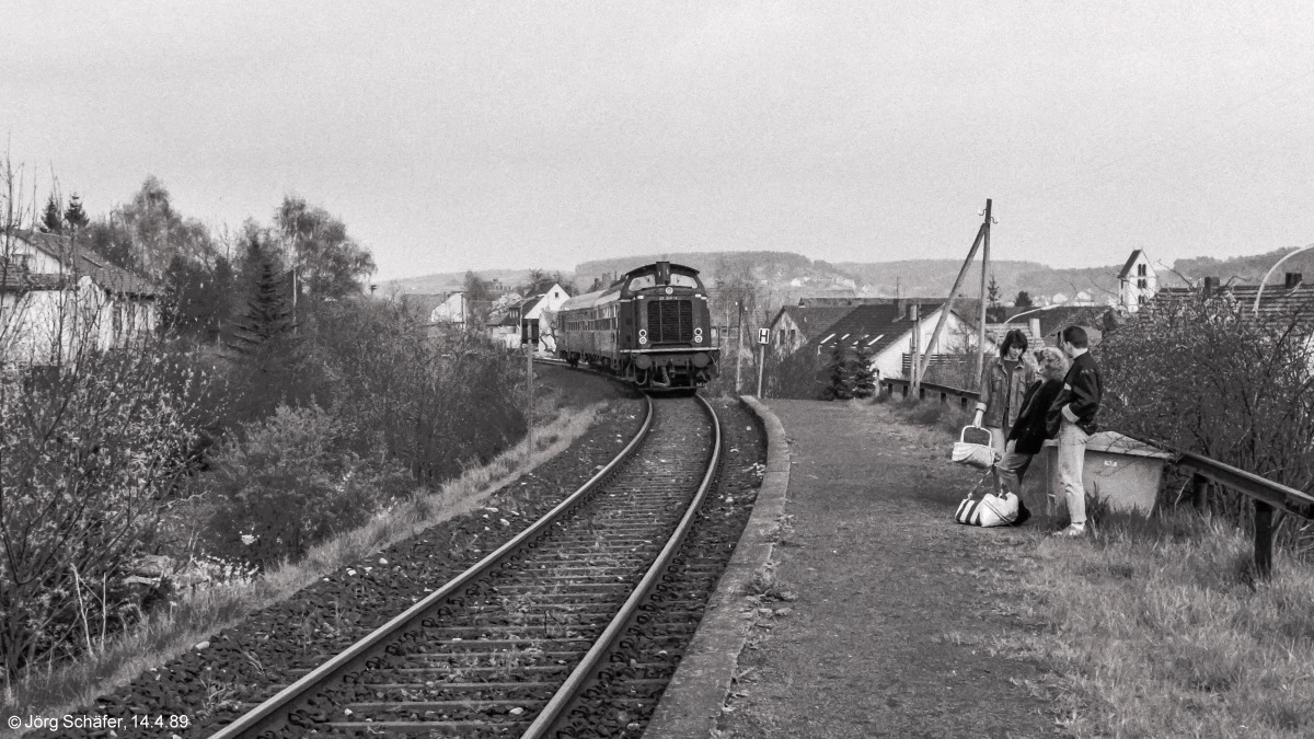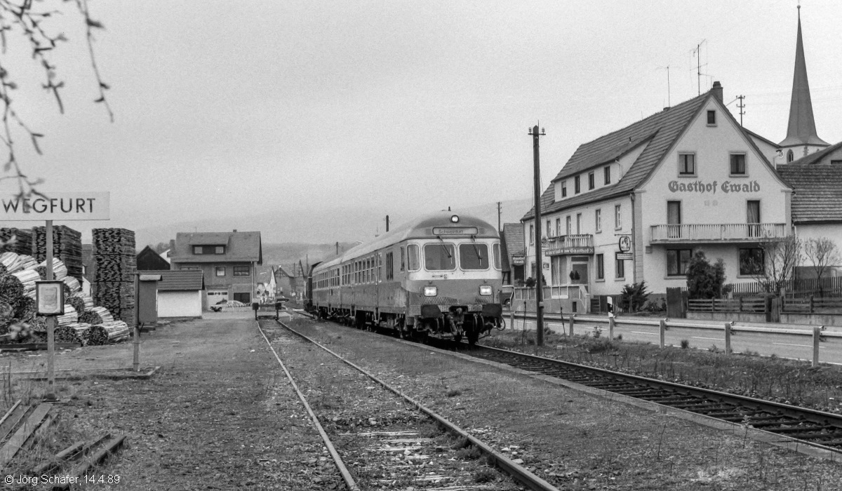Der Abendzug nach Bischofsheim erreichte am 14.4.89 Brendlorenzen. Vom Bahnhof Bad Neustadt hatte er zwar erst 1,0 Strecken-km, aber immerhin schon fast 20 Höhenmeter hinter sich. Jörg Schäfer