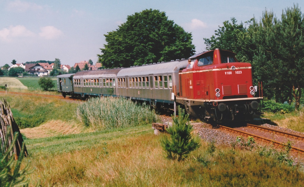 V 100 1023 steht am 20.6.98 mit ihrem Sonderzug zur Rückfahrt bereit in Hemhofen. Der Bahnhof lag in Strecken-km 11,8 - die 10,9 folgenden Kilometer nach Höchstadt an der Aisch waren damals schon nicht mehr befahrbar. Jörg Schäfer