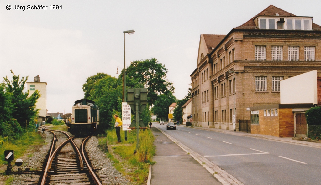 211 039 setzt am 5.9.94, dem Aktionstag "Mobilohne Auto", in Höchstadt/Aisch um. Der Blick geht nach Westen - so hätte die Einfahrt eines Zuges aus Neustadt/Aisch ausgesehen, wenn die Lücke von nur 7 km zur KBS 806 in Demantsfürth-Uehlfeld geschlossen worden wäre! Jörg Schäfer