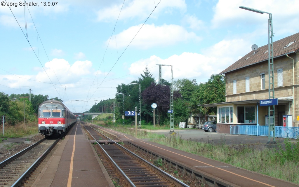 13 Jahre nach Bild 874210 fehlte in Strullendorf das Gleis 1, ansonsten hatte sich wenig verändert: Die Bahnsteigunterführung wurde erst drei Jahre später gebaut. Eine verkehsrote RB nach Nürnberg fuhr am 13.9.07 auf Gleis 3 ein. Jörg Schäfer