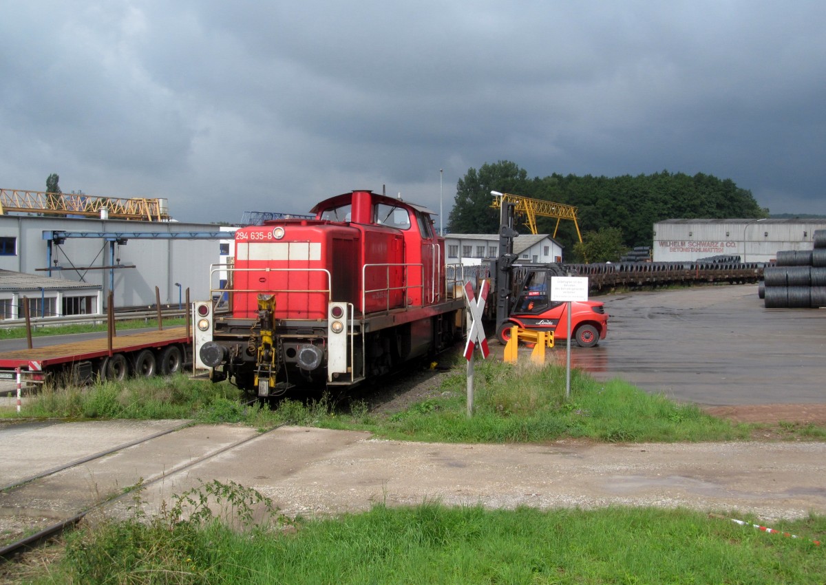 294 635-8 mit ihrem Drahtrollenzug aus Riesa bei der Entladung im Anschlussgleis der Firma Schwarz in Schlüsselfeld am 16. August 2014. Frankenwaldbahner
