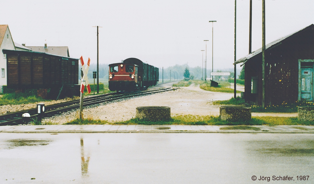 Im strömenden Regen fuhr der Übergabezug im Mai 1987 durch den Haltepunkt Mühlhausen nach Neumarkt zurück. Bemerkenswert sind sowohl der ehemalige Güterwagen als Güterschuppen links wie auch das hölzerne Bahnhofsgebäude rechts. Jörg Schäfer
