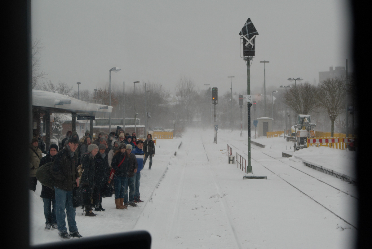 Am 23.12.2010 war die Strecke Flensburg - Kiel geprägt vom Schnee. Während weiter nördlich in Rieseby Schneewehen auf der Strecke zu sehen waren, war auch der Bahnhof Eckernförde verschneit. Blick durch die Tür des LINT 41. Das Bild zeigt den Zustand des Bahnhofs Eckernförde noch vor der Realisierung des ESTW. Julian Düll