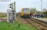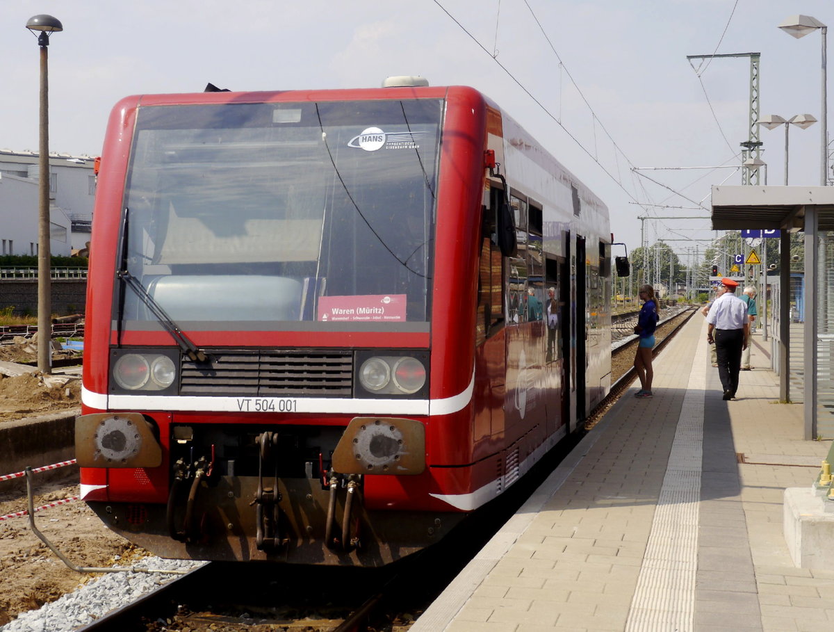 Den von der Mecklenburgischen Südbahn verbliebenen Restbetrieb Waren - Malchow erledigt "der Hans" mit einem einzigen LVT-Umlauf: VT 504 001 (D-EGP) in Waren (Müritz) am Sonntag, 22.7.18. Hermann-Josef Weirich
