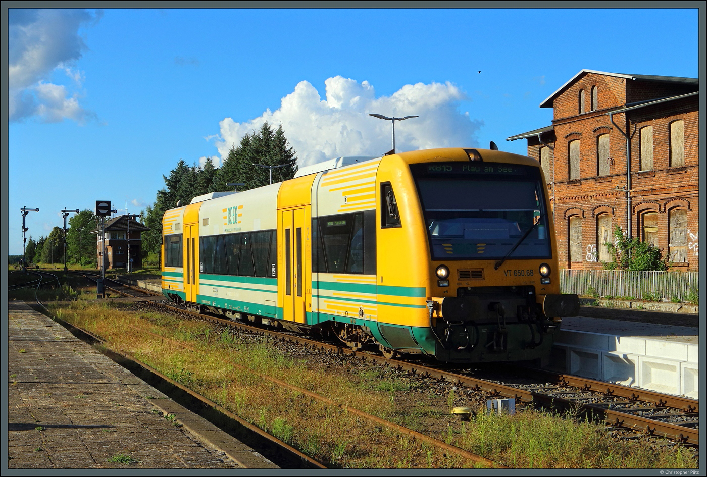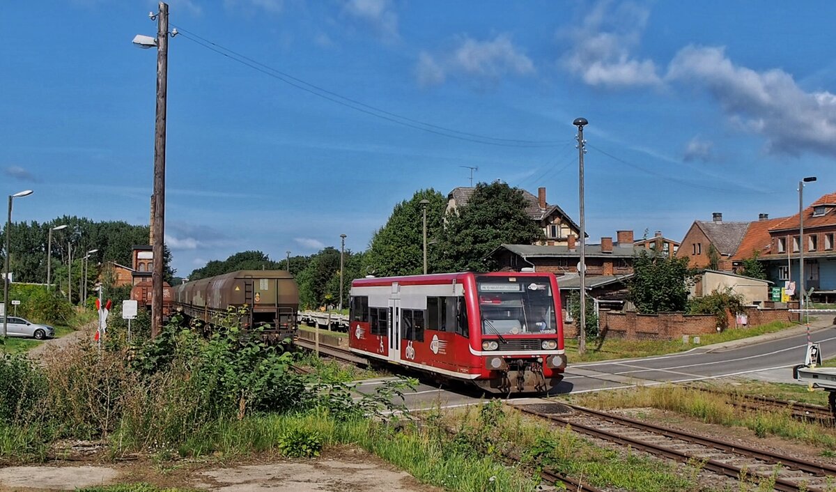 Aus Pritzwalk kommend erreicht 672 907 der Hanseatischen Eisenbahn am 30.08.2025 den Bahnhof Plau am See. Nach kurzem Aufenthalt geht es für den LVT-S über Meyenburg und Pritzwalk zurück nach Kyritz.