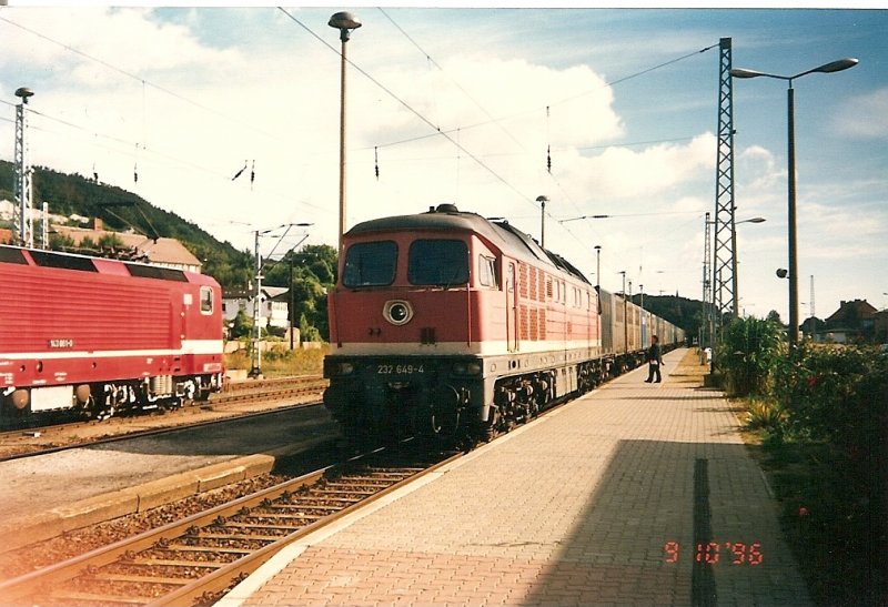 Ein aus Belgien kommender Containerganzzug mit Autoteilen für eine schwedische Automarke mit der Lok 232 649 am 10.09.1996 wartet auf Ausfahrt Richtung Sassnitz Hafen. Mirko Schmidt