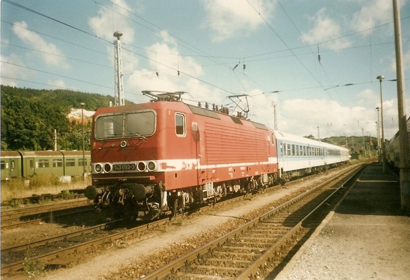 Ein Foto vor meiner Digitalkamerazeit.Als es noch den Interregio gab.Der Interregio Sassnitz-Berlin mit der 143 093 abgestellt in Sassnitz.Es fehlen nur noch die Kurswagen Malmö-Berlin. Mirko Schmidt