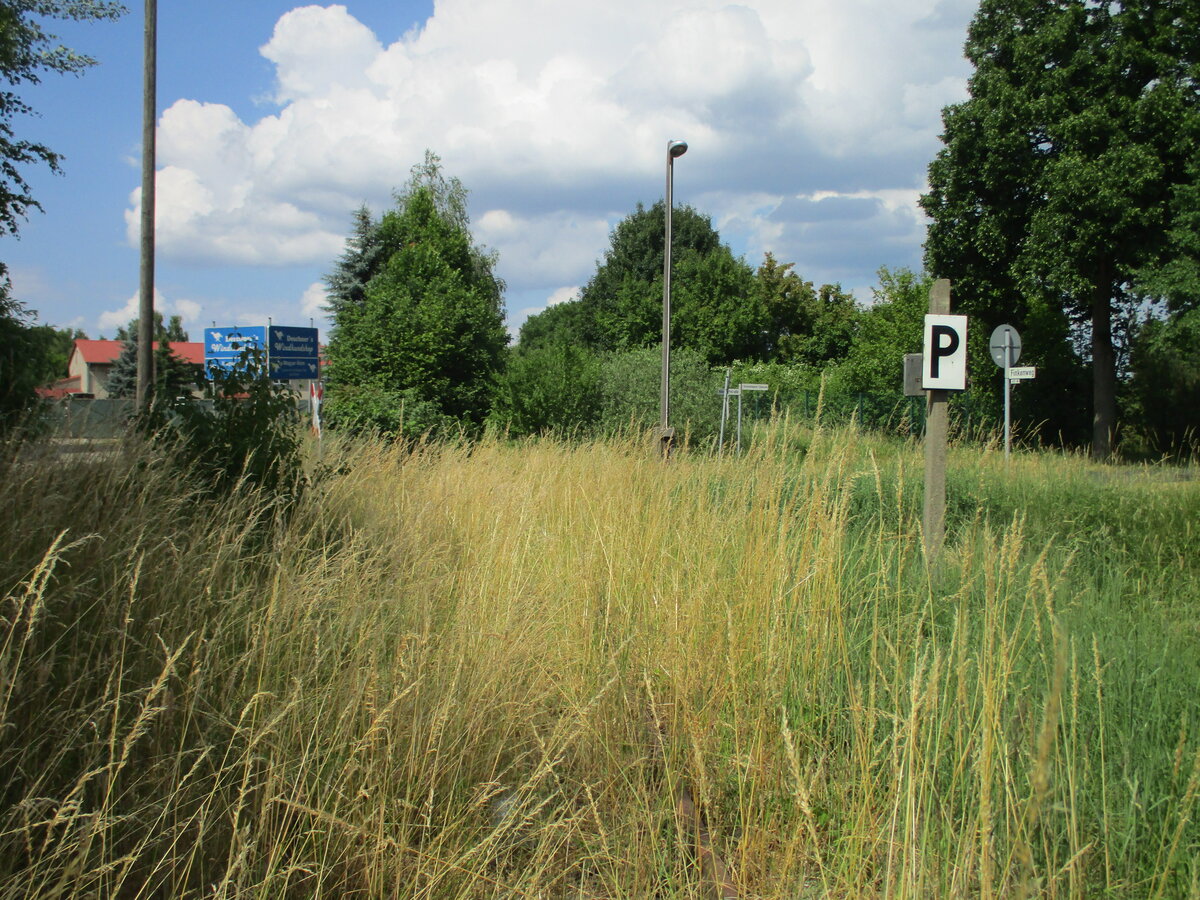 Die Pfeitafel Richtung Liebenwalde steht in Zehlendorf immer noch vor dem unbeschrankten Überweg.Die Gleise sind teilweise zugewachsen.Aufgenommen am 26.Juni 2021. Mirko Schmidt