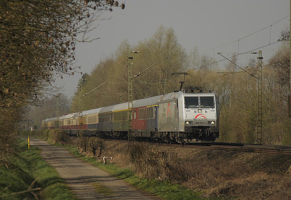 Wegen Bauarbeiten am Wochenende im Abschnitt Münster - Rheine nahm der DPF 25153 nicht den kürzesten Weg nach Papenburg, sondern fuhr über die Rollbahn und Osnabrück. In Osnabrück Hellern kam mir der lange Sonderzug mit Zuglok TXL 185531 um 10.12 Uhr vor die Linse gefahren. Der Zug bestand aus ehemaligen Rheingold Wagen mit Dome Car. Interessant auch der direkt hinter der Lok laufende Halbspeisewagen. Gerd Hahn