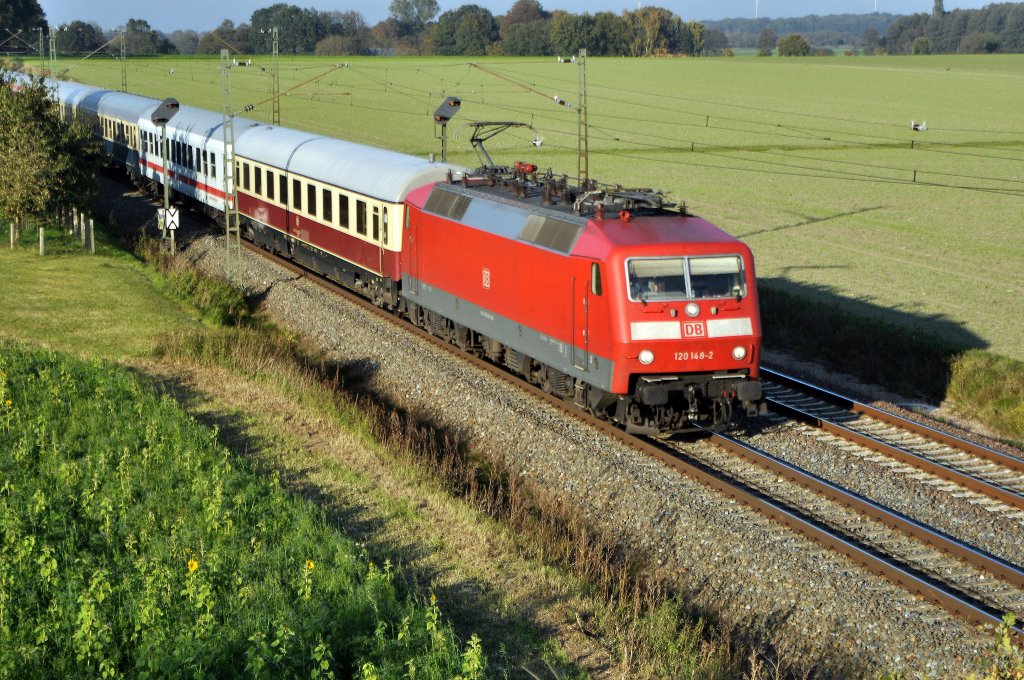 DB Fernverkehr 101 001 "Klagenfurt am Wörthersee" mit IC 2311 Westerland (Sylt) - Stuttgart Hbf begegnet einem Containerzug, (Marl, NI, 23.10.11). Reinhard Kühn